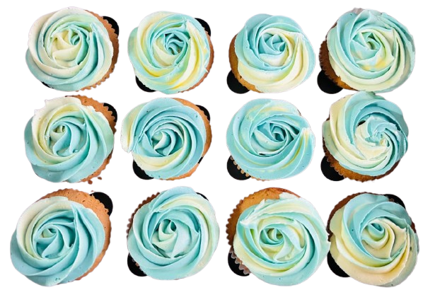 Delicate cupcakes crowned with hand-piped rose swirls in soft shades of seafoam blue and creamy vanilla. Light, elegant, and dreamy, they evoke the calm beauty of ocean waves meeting fresh spring blooms—perfect for weddings, showers, or any celebration that calls for a touch of sweetness and sophistication.